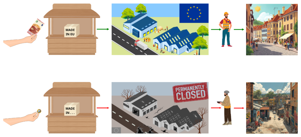 • ciò che viene prodotto in EU dà lavoro a chi vive in EU favorendo socialità, occupazione e redditi, ovvero ricchezza e stabilità imprescindibili oggi come domani